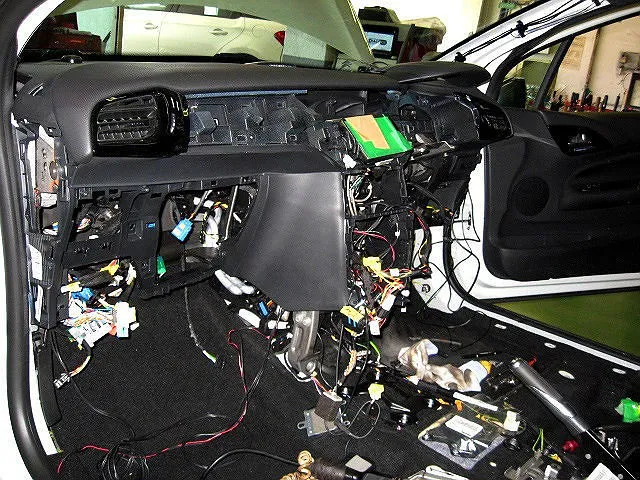 原因はエバポレーターからのガス漏れだったので作業的には部品交換になりますが、これがダッシュボードの奥に設置されていますので、写真の通り内装はほぼまる裸まで分解する事に・・・